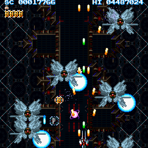 What is special to CRS68K in this regard is that you can pick up all three of these at once if you center yourself more or less accurately inside the triangle and wait a bit. When done correctly the power-ups with begin to spin faster and eventually all belong to you, unless you mess up and one of them rotates into your shit prematurely. This and the fact that once you have everything maxed out you get 25600 points per pickup, so that is a good 76800 points per powerup ship and one of the main ways to get high scores. The other big part of your score is that at the end of each level you get a bonus for each life and bomb you have left as well as a shield bonus if you were not hit by the boss and still have your shield. CRS68K is fast, but it gives you shields and a lot of lives, so it is doable, and to my knowledge there have been people who managed it through the entire game (which is in fact two loops, meaning you have to play the whole thing again a bit harder once you get through the first time) without dying, maybe even without bombing.