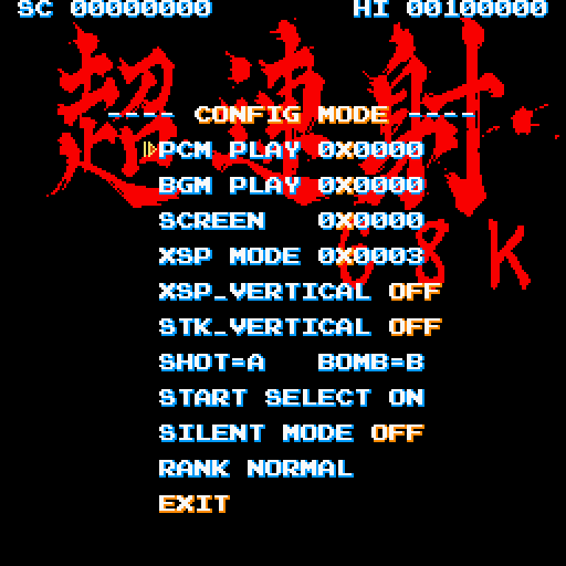 You can also set the difficulty from normal to hard, which will make the enemies spawn bullets when being killed right away and give you even harder ones in the second loop. There is also a sound and music test. The rest of the options seem to do nothing in the Windows version because the useless stuff which only works for the original hardware was not removed it seems. Also the buttons F1, F4 and F5 can be used to change the screen between non scaled, full screen and full screen with scanlines. All other F-keys make the screen go black, which is not that useful.